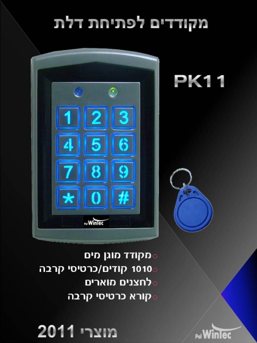 5. מקודדים לפתיחת דלת מדגם PK11 . מקודד מוגן מים הכולל 1010 אפשרויות קידוד , לחצנים מוארים , קורא כרטיס קרבה . |